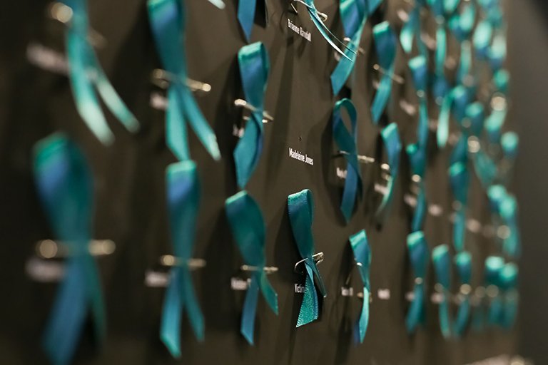 Standing in front of the poster, one can’t help but reach for a teal ribbon. As you pull it away from the wall, a survivor’s name is unveiled.